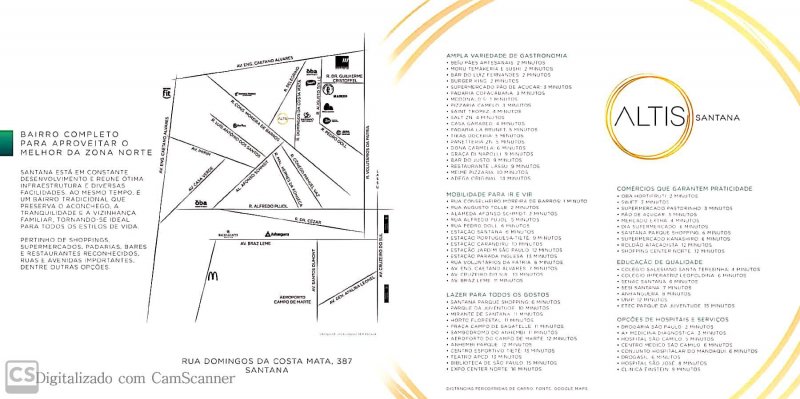 O projeto será desenvolvido na melhor localização da zona norte, entre as Avenidas Braz Leme , Engenheiro Caetano Álvares e Ruas Alfredo Pujol , Alameda Afonso Schmidt , Voluntários da Pátria , Conselheiro Moreira de Barros , conhecidas como as melhores e mais tradicionais ruas de Santana. . A Altis Santana também tem a comodidade de ser vizinha da escola mais reconhecida do bairro, o Colégio Salesiano Santa Teresinha . Além disso, oferece acesso direto às ruas Pedro Doll e Augusto Tolle , que possuem diversos tipos de estabelecimentos e serviços, como Drogaria São Paulo, Drogasil, Padaria La Brunet, Petland, a+ Medicina Diagnóstica, supermercado Pão de Açúcar, Oba Hortifruti e fica bem próximo ao Complexo Hospitalar Mandaqui. Neste endereço você também encontrará mais conforto e qualidade de vida, pois terá à disposição uma ciclovia e uma trilha arborizada, na Avenida Braz Leme, e morará próximo ao Santana Parque Shopping e ampla rede de transporte público. , tanto ao longo do corredor da Avenida Engenheiro Caetano Álvares como a partir da estação de Santana. Outra vantagem da localização do Altis Santana é que seus moradores terão fácil acesso às Avenidas Cruzeiro do Sul, General Ataliba Leonel, Santos Dumont e Engenheiro Caetano Álvares , proporcionando o melhor conceito de mobilidade urbana.