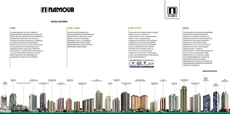 Fundada em 1.976. Desde então a NAMOUR Incorporadora e Construtora Ltda, vem adquirindo respeito e confiança no ramo imobiliário de São Paulo. Atuando no setor comercial e residencial de forma integrada (Incorporando e Construindo), onde a gestão passa desde o planejamento do empreendimento, comercialização, execução, entrega e pós-entrega. Onde performou mais de 1 milhão de metros quadrado em áreas construídas, em seus 60 empreendimentos lançados ao longo de sua história