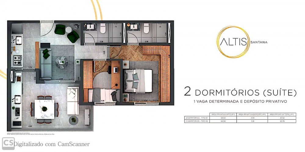 02 dormitórios - Tipo 01 - 64,58 m2 - Depósito Privativo - 3,00 - Área Privativa - 67,58 m2.